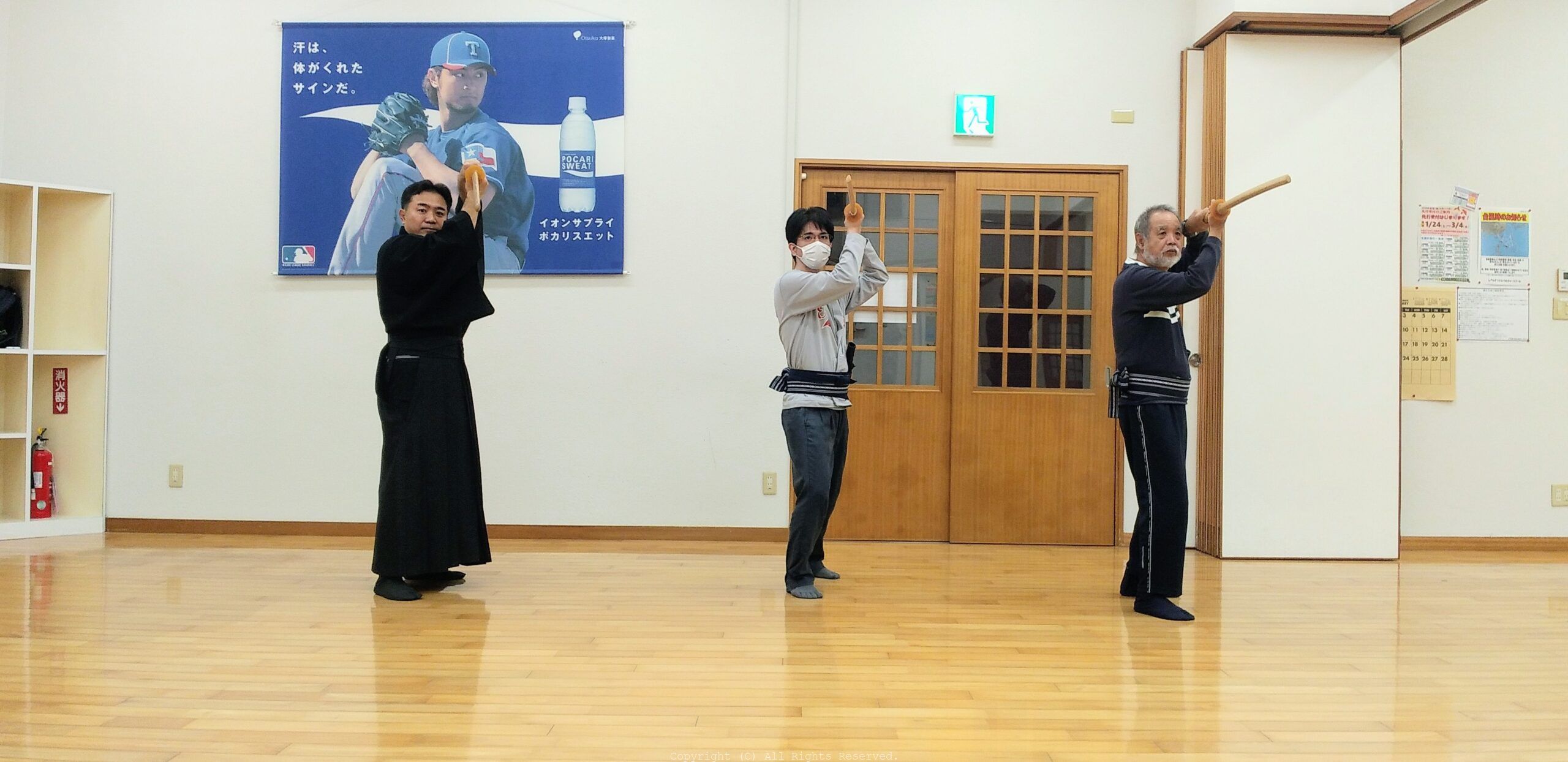 本日の稽古 ・基本所作 ・刀の振り方 ・基本抜刀納刀 ・足運び ・抜刀術 .剣術(巻落) ・受け返し(真向〜脚斬り)